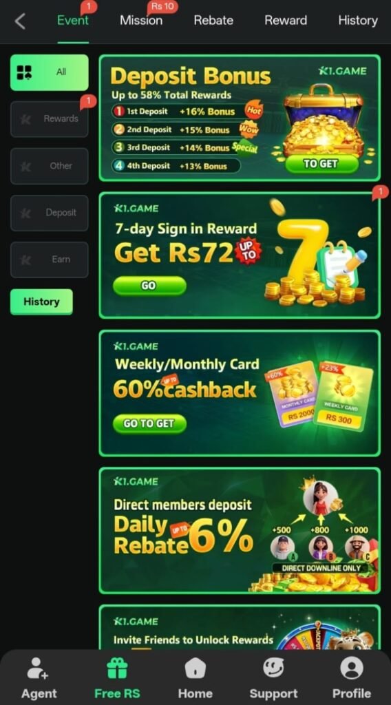K1 Game offers a referral system. You can invite your friends using your referral link. When they join and play, you earn commission or bonus rewards.